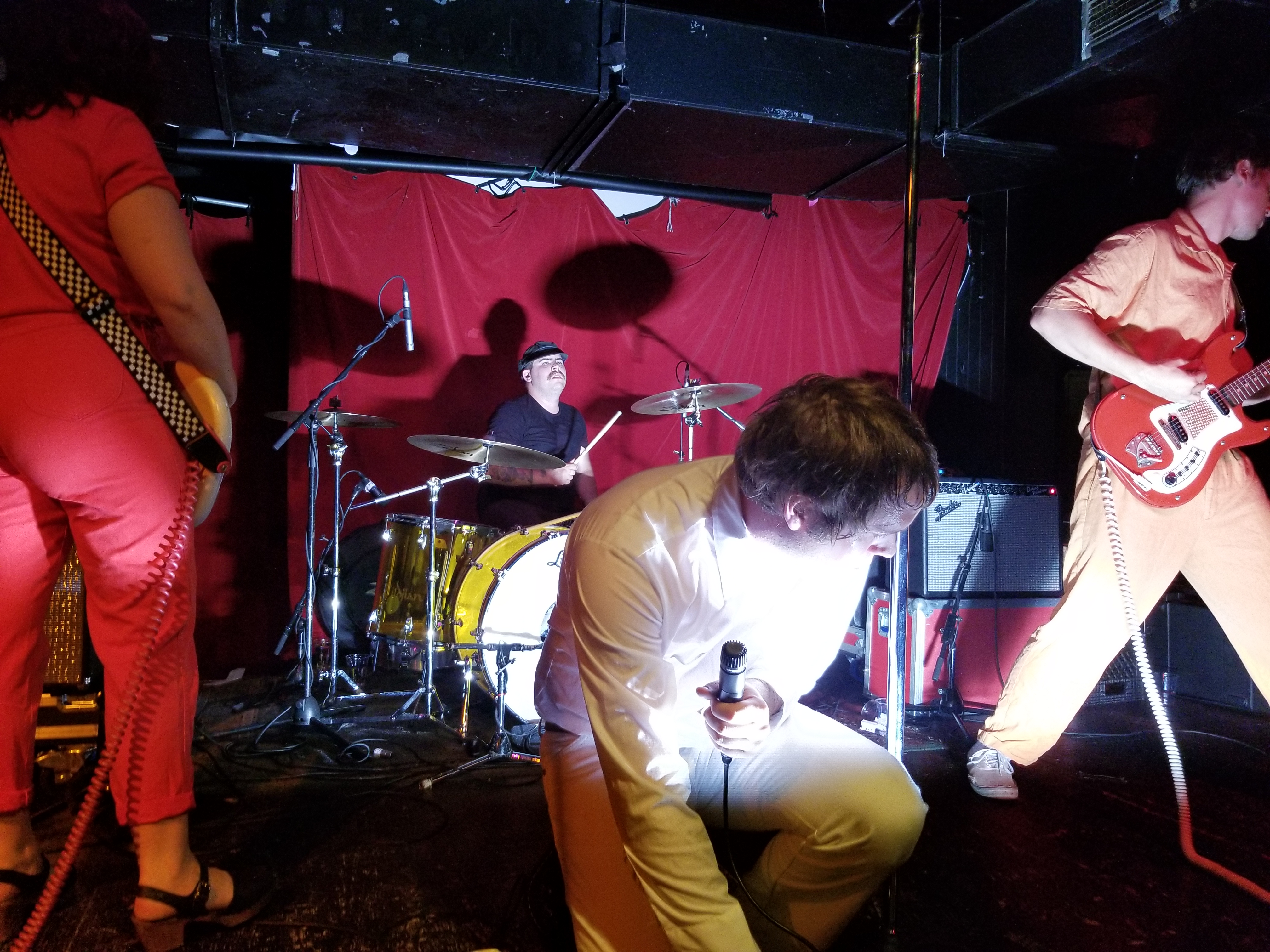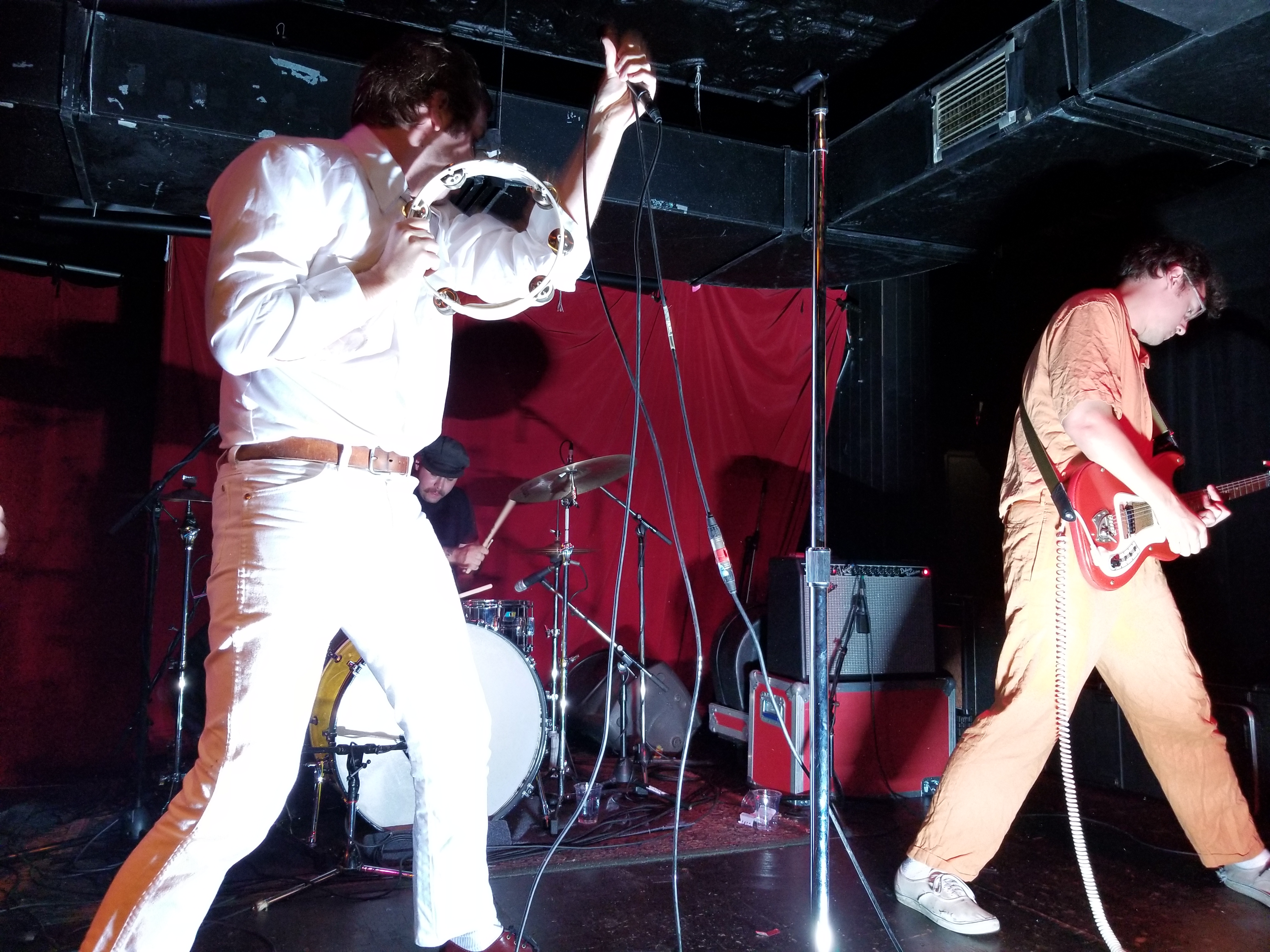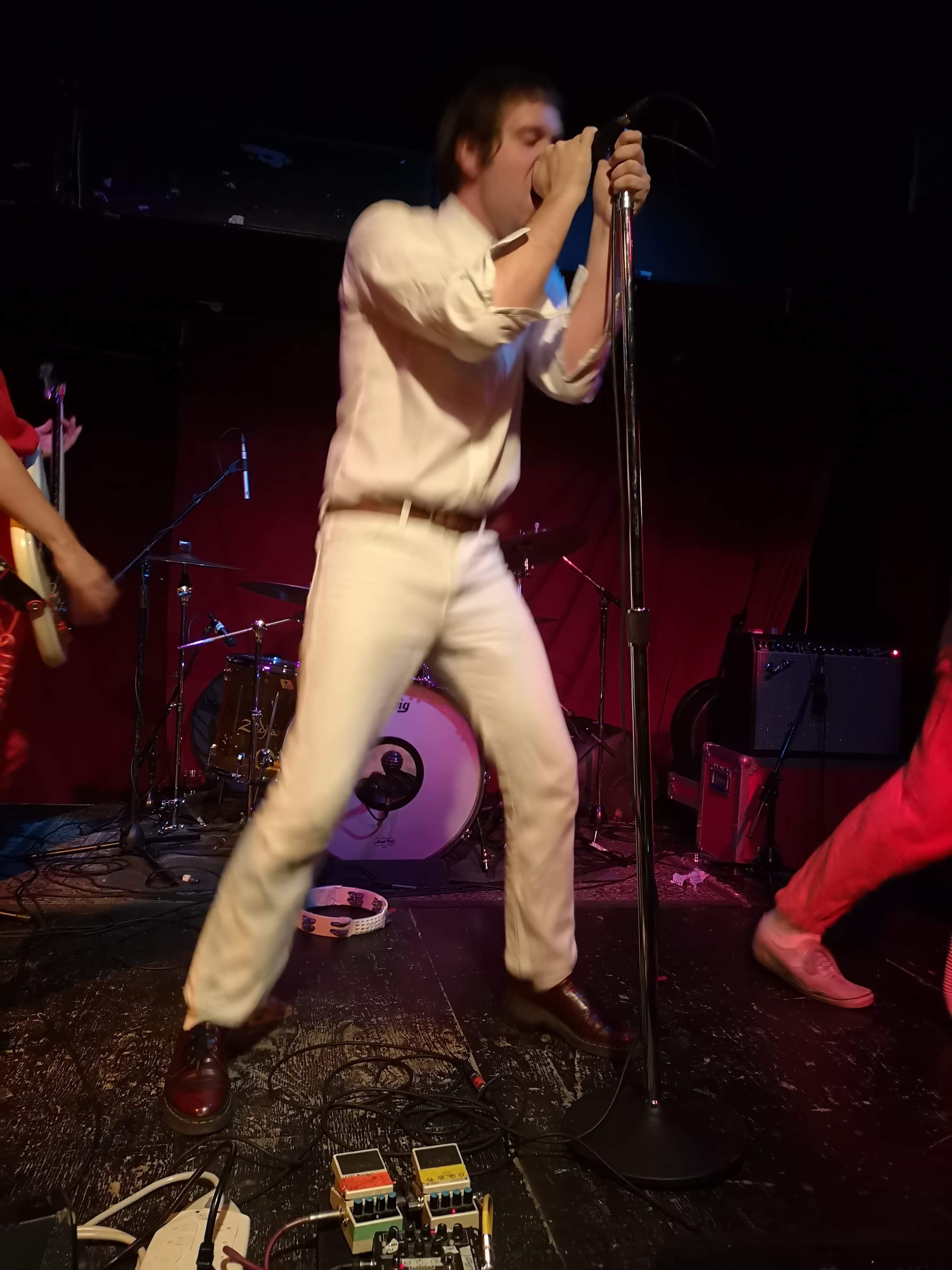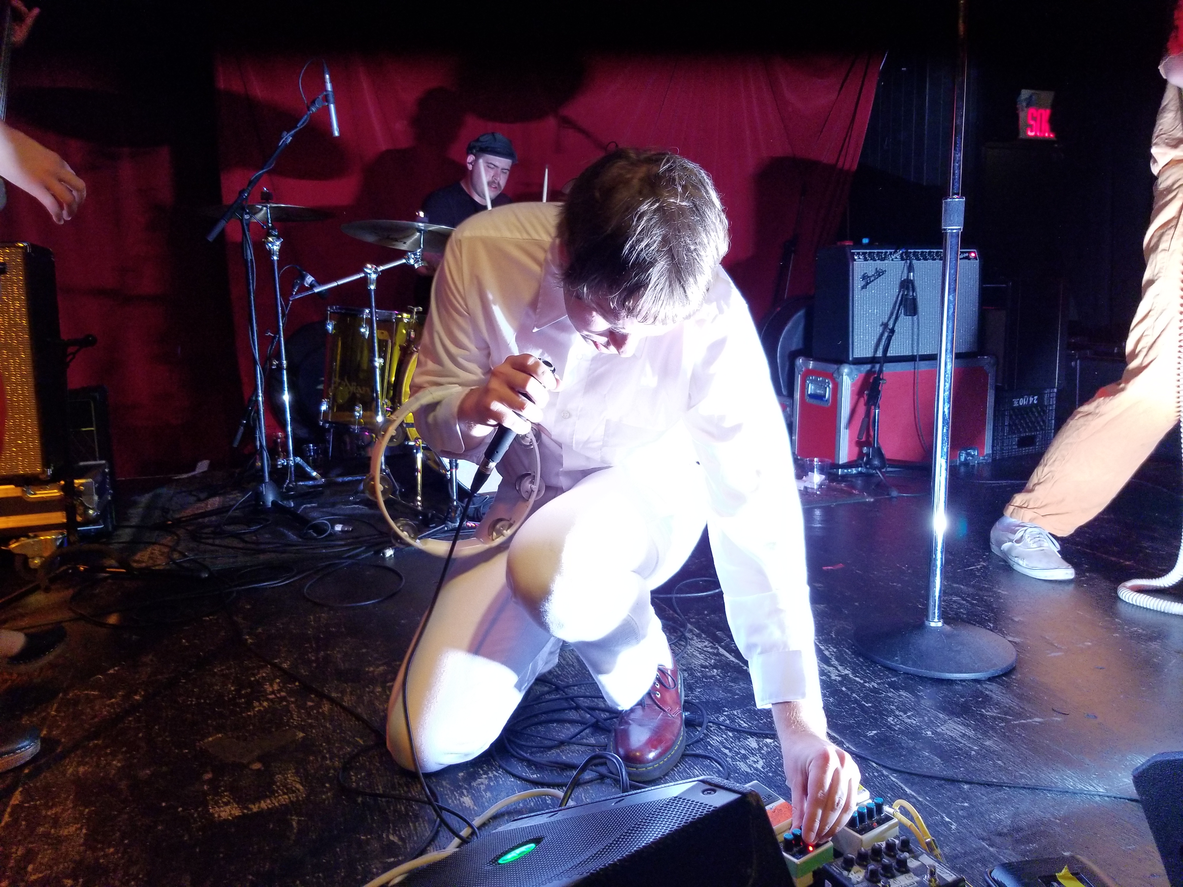 When Mike Krol came on, well just – – – HOLY F%*K!! For starters, we were floored by the band’s appearance. Each member was dressed in a different one-color whole-body jumpsuit sort of outfit, which worked excellent visually, along with their spirally colored guitar cords. And Mike had this debonair casual flair going on, with white jeans, white shirt, a swanky burgundy leather belt, and burgundy Doc shoes. The way he moved around was great, the way he grabbed the mic and belted out his heartfelt singing and switching his sound pedals and strobe light on and off during various parts throughout the songs. He even did some stunts, jumping off the drum kit and with his tambourine. And then he paraded around the floor.