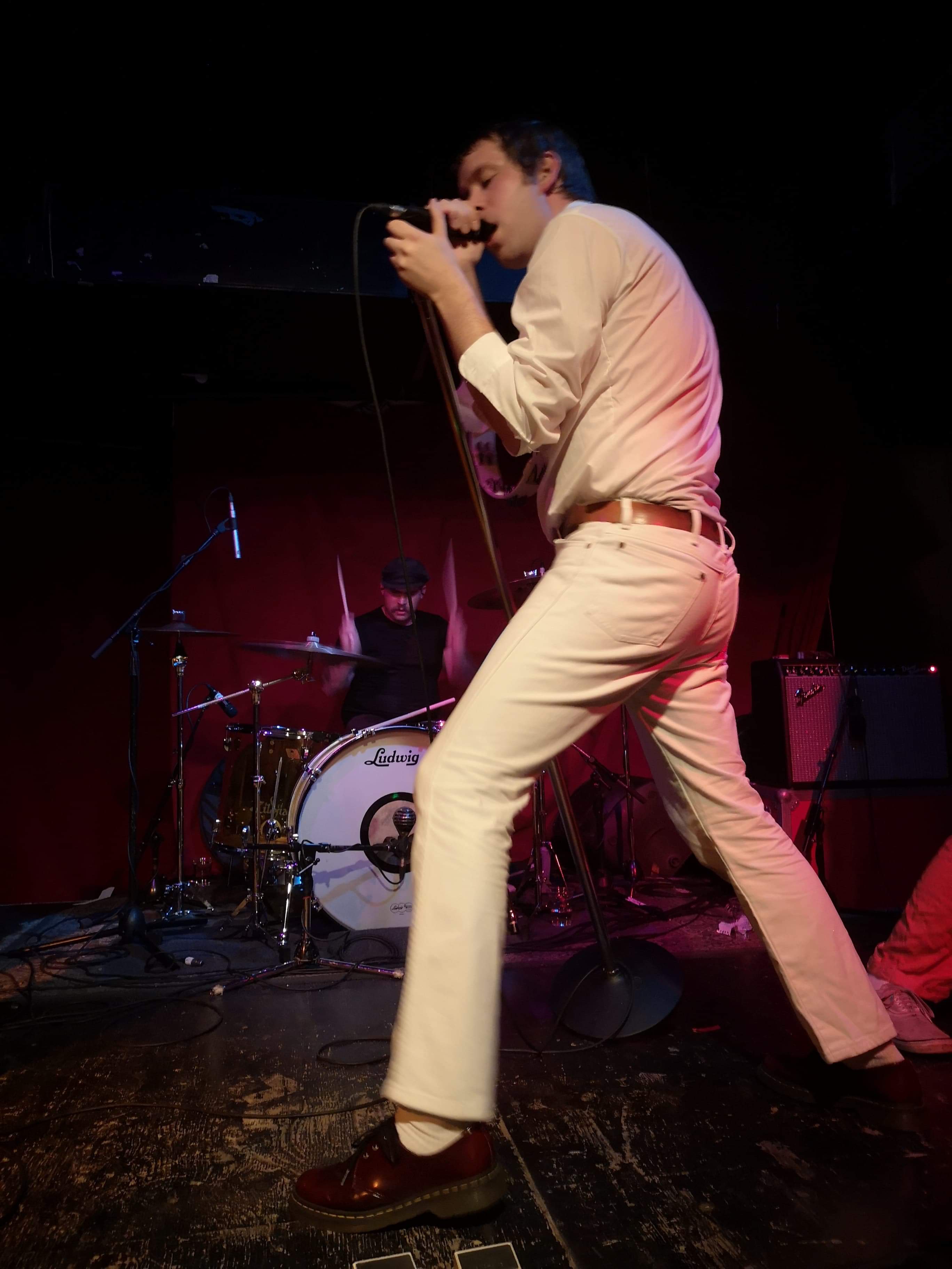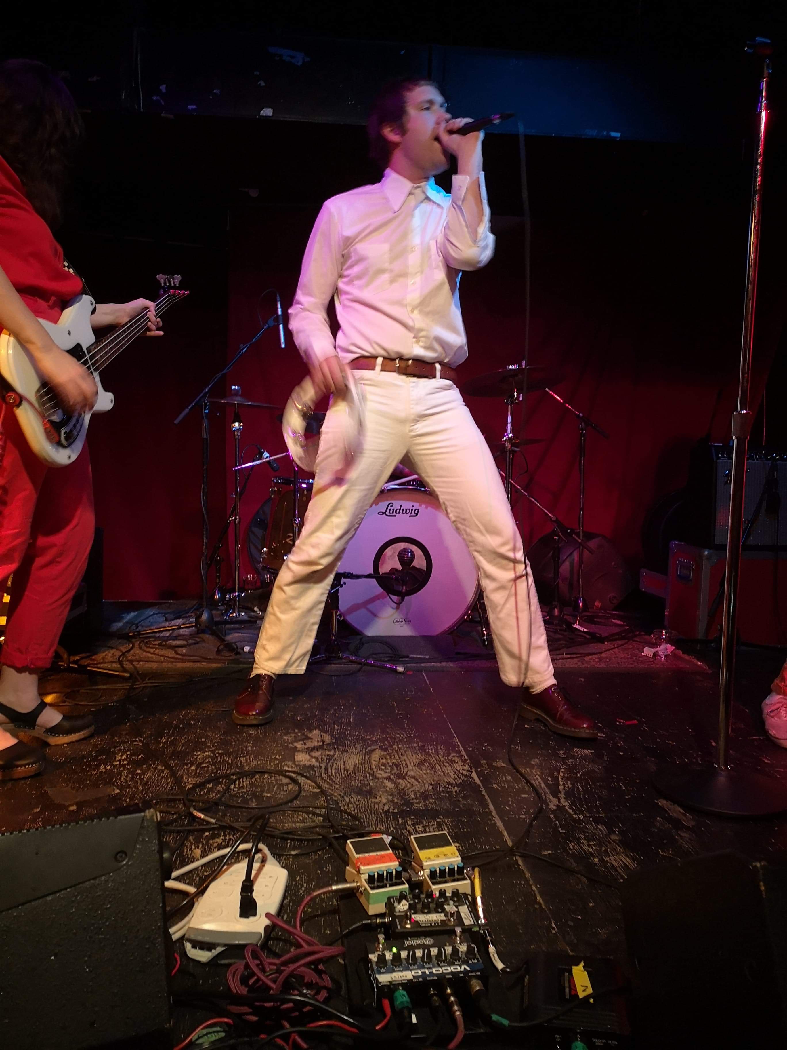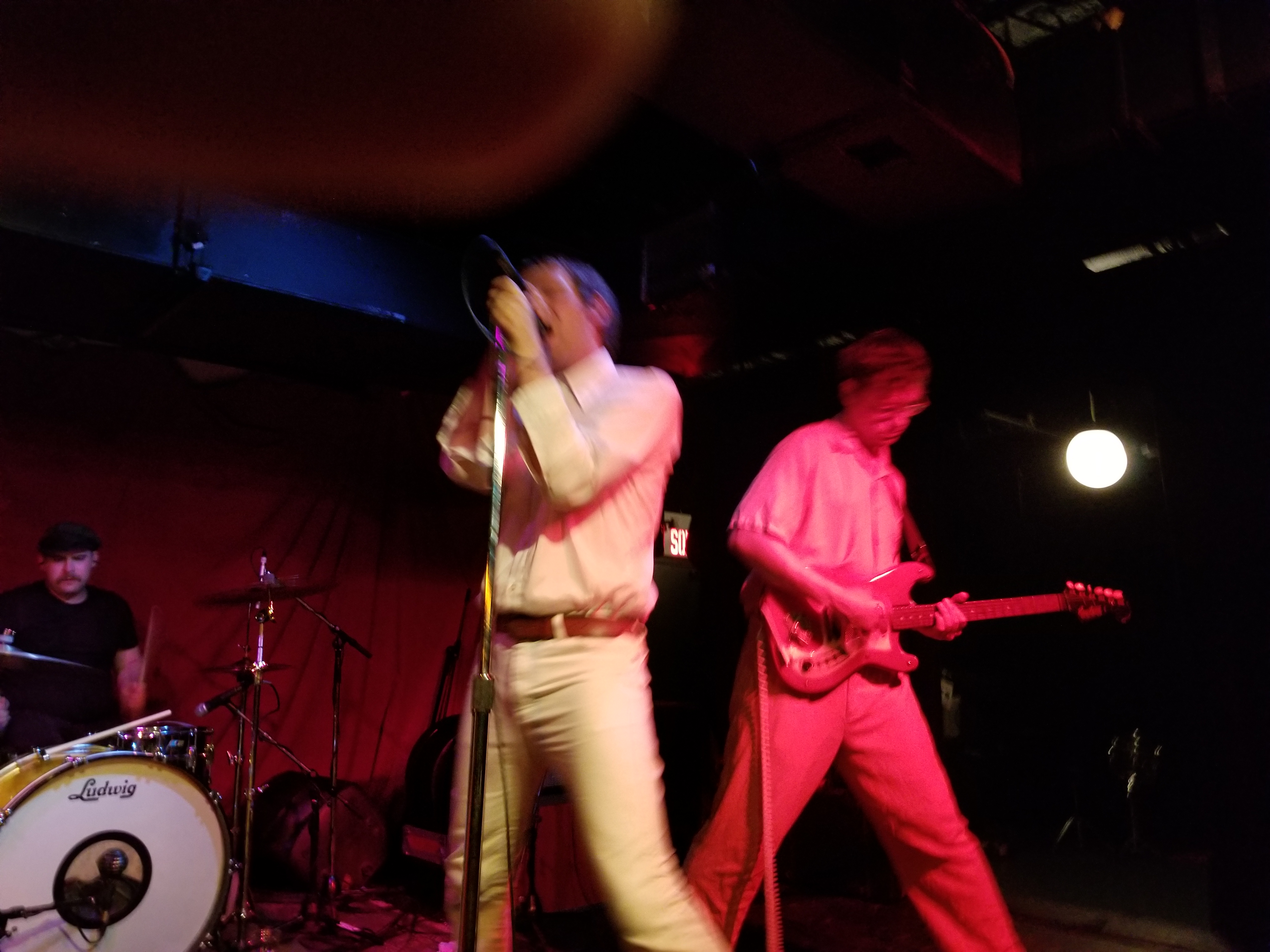 When Mike Krol came on, well just – – – HOLY F%*K!! For starters, we were floored by the band’s appearance. Each member was dressed in a different one-color whole-body jumpsuit sort of outfit, which worked excellent visually, along with their spirally colored guitar cords. And Mike had this debonair casual flair going on, with white jeans, white shirt, a swanky burgundy leather belt, and burgundy Doc shoes. The way he moved around was great, the way he grabbed the mic and belted out his heartfelt singing and switching his sound pedals and strobe light on and off during various parts throughout the songs. He even did some stunts, jumping off the drum kit and with his tambourine. And then he paraded around the floor.