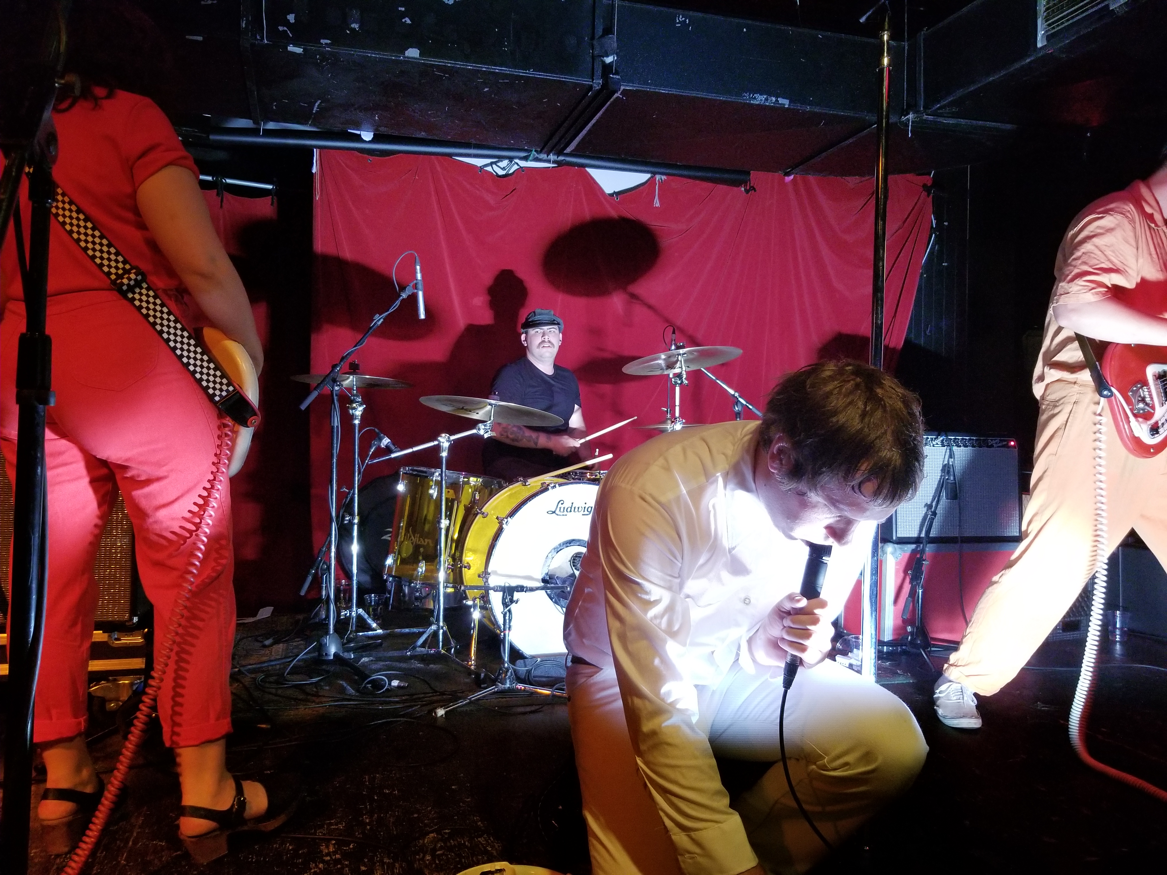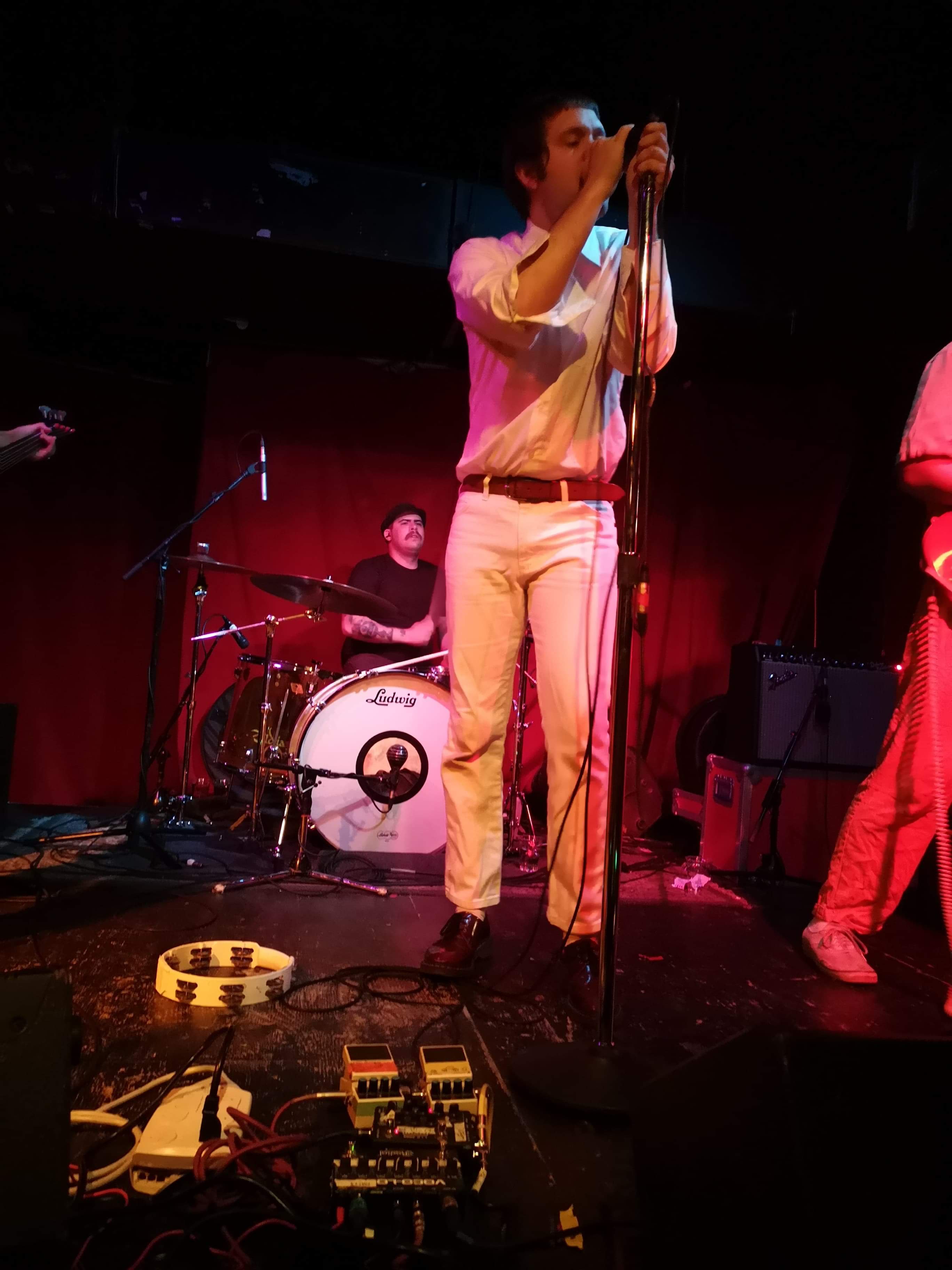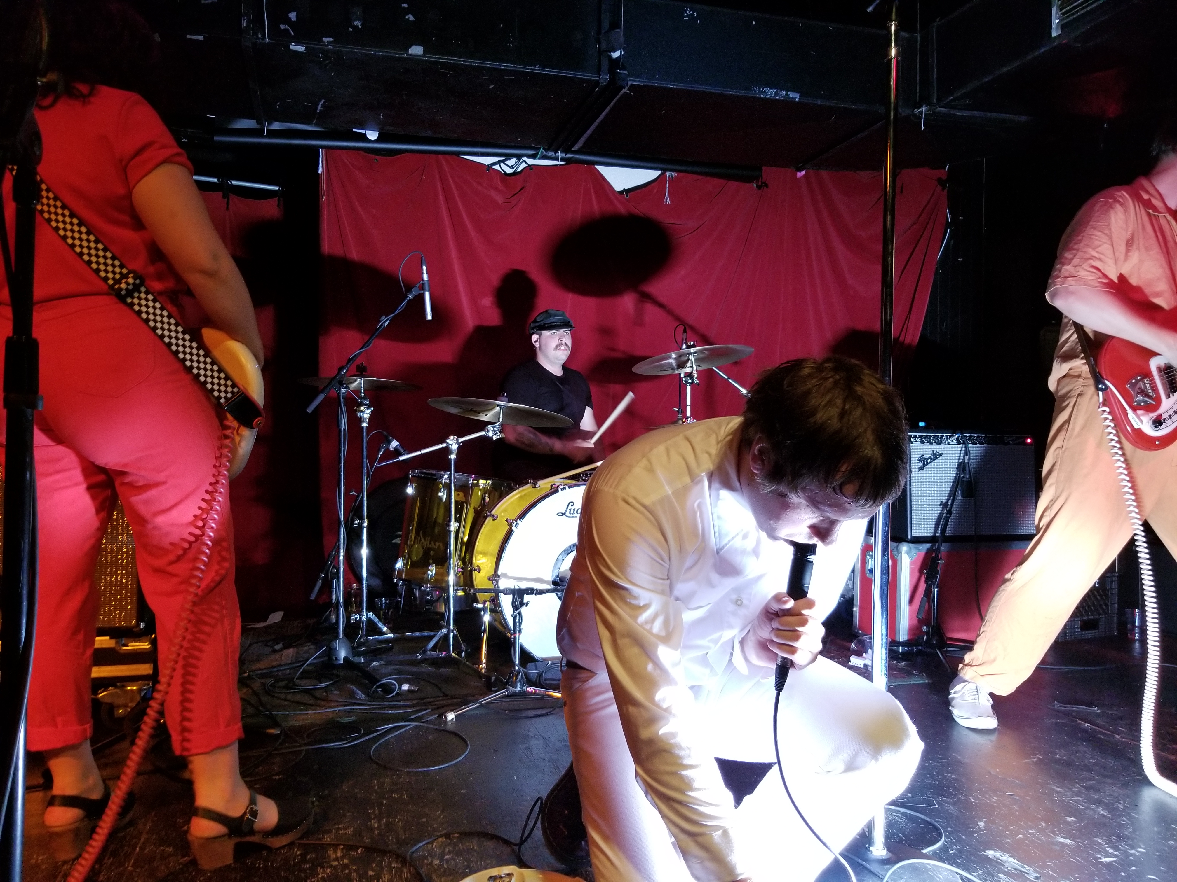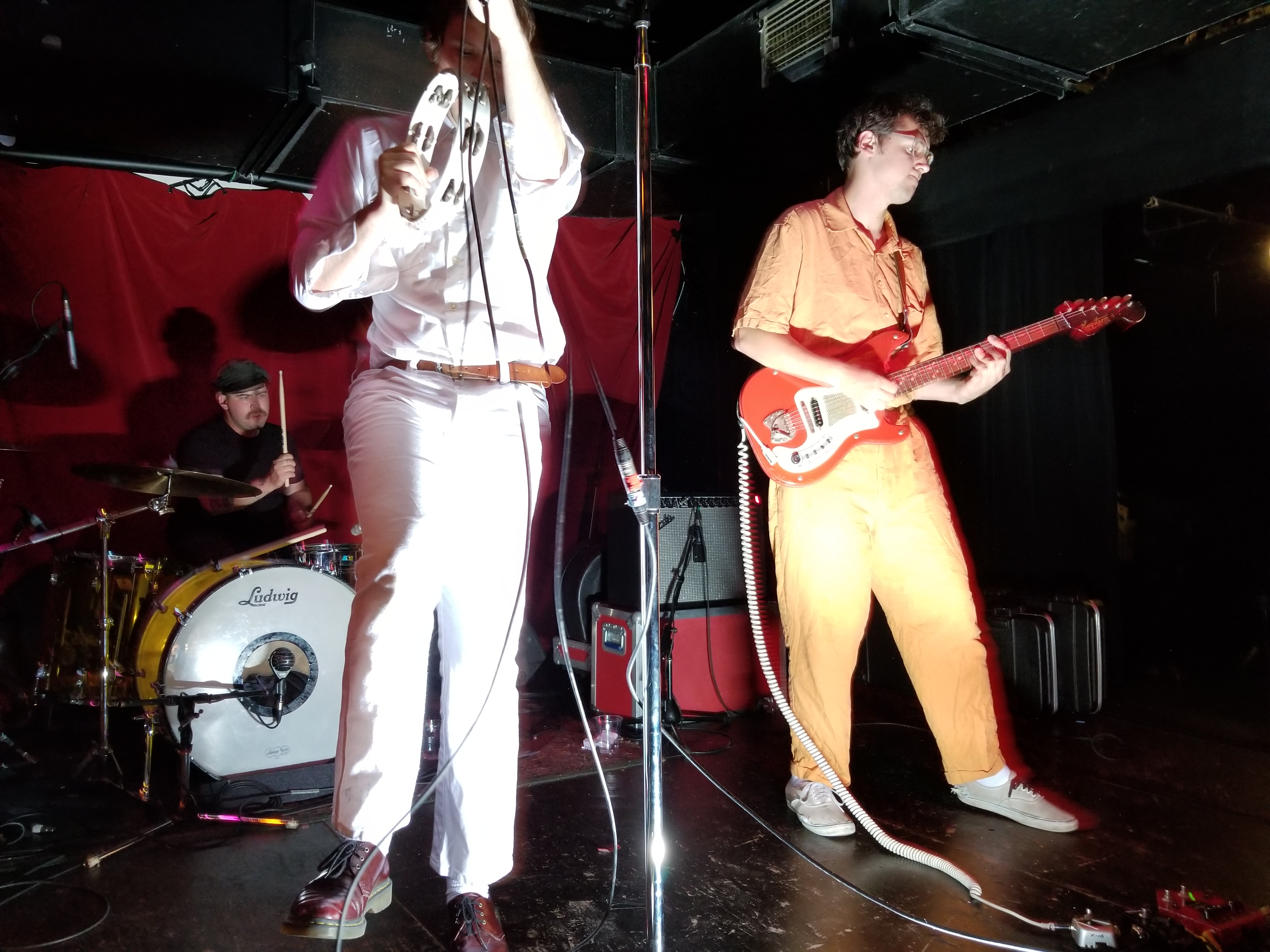 When Mike Krol came on, well just – – – HOLY F%*K!! For starters, we were floored by the band’s appearance. Each member was dressed in a different one-color whole-body jumpsuit sort of outfit, which worked excellent visually, along with their spirally colored guitar cords. And Mike had this debonair casual flair going on, with white jeans, white shirt, a swanky burgundy leather belt, and burgundy Doc shoes. The way he moved around was great, the way he grabbed the mic and belted out his heartfelt singing and switching his sound pedals and strobe light on and off during various parts throughout the songs. He even did some stunts, jumping off the drum kit and with his tambourine. And then he paraded around the floor.