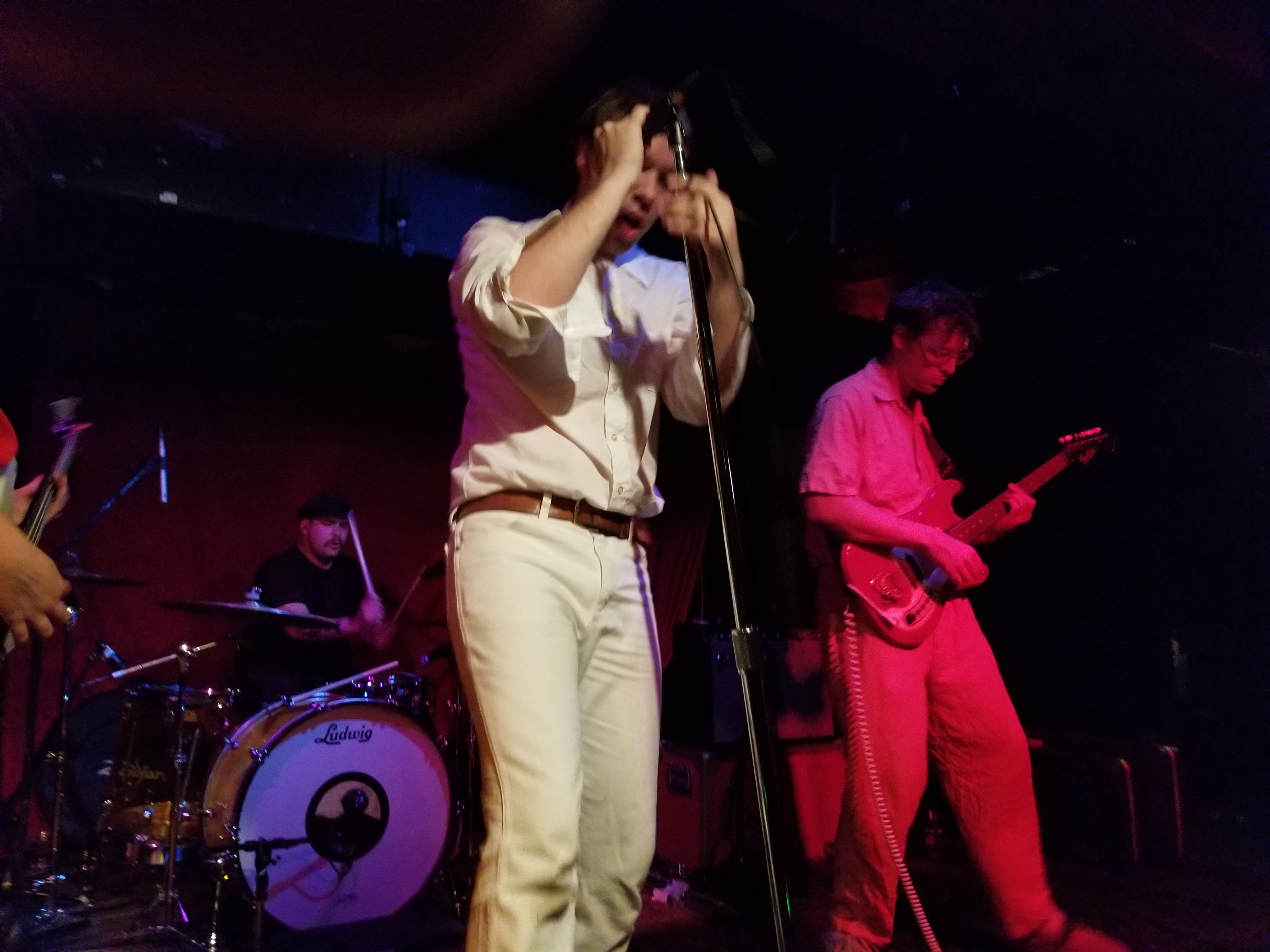 He asked if we knew Swearin’ who were actually on stage playing and I said I didn’t but asked how he met them and he said the singer, Allison, was his fiancé and they were on the same label – Merge. I asked were they from California and was he still living there, and he said that Swearin were from Pennsylvania but that Allison lived with him in California. He then politely excused himself and said that he had to rest his throat before the show, and so we cheered again/fist-glass bumped again and said that we could talk later.